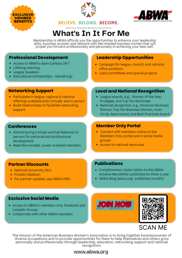 For more information, please contact the Professional Development Chair or any of the board members; you can send an email to ABWAMoKan@gmail.com.