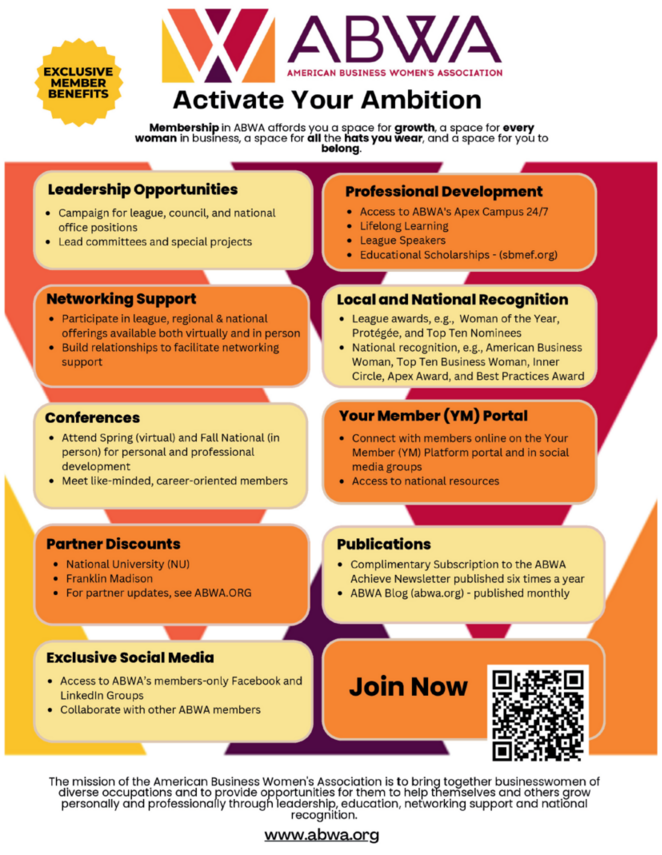 Outside speakers present various topics each month. Topics focus on professional development, including some personal development issues to enhance members’ individual ‘brand’. If you are interested in presenting at one of our meetings or know of a good candidate, please send an email to ABWAMoKan@gmail.com. Visit the Events page for past and upcoming programs!